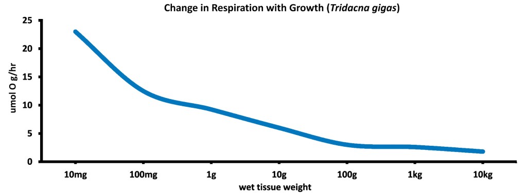 The answer isn’t spelled out in the text of any of these papers, but it can be found in the data and was also noted by Fischer et al. (1985). What happens is that respiration rates generally decrease rapidly as tridacnines get larger. In other words, the amount of C/E needed to run each gram of clam tissue gets lower and lower as a clam gets older and older (with the apparent exception of hippopus for some unexplained reason).